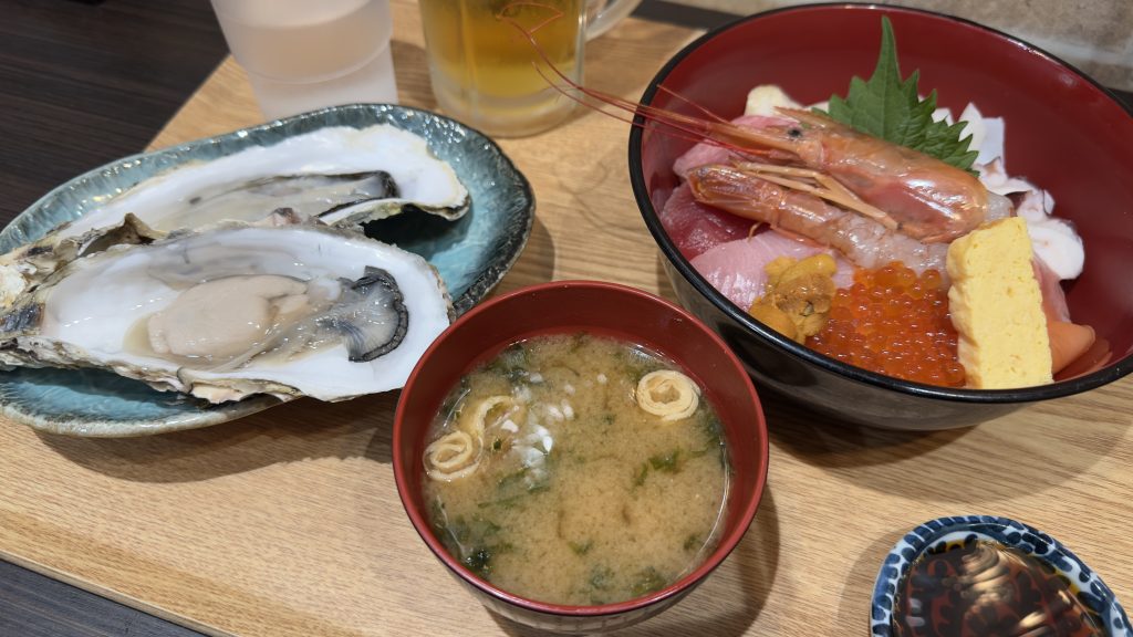 自分らは店内で食べれる「はましん食堂」で海鮮丼と牡蠣、ビール注文してイートイン。